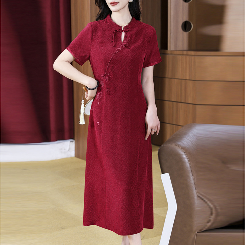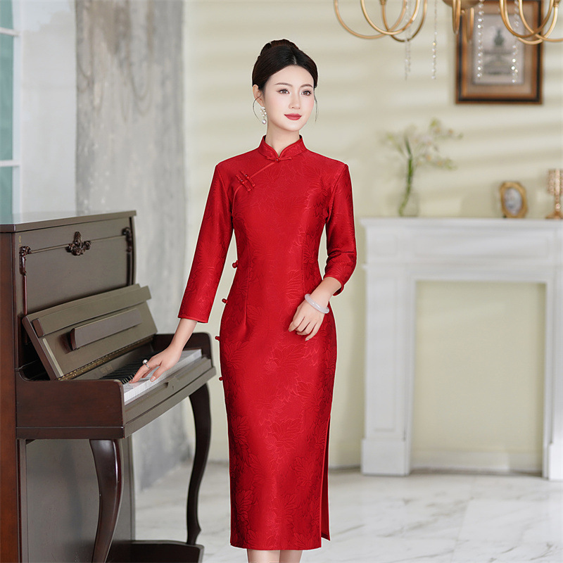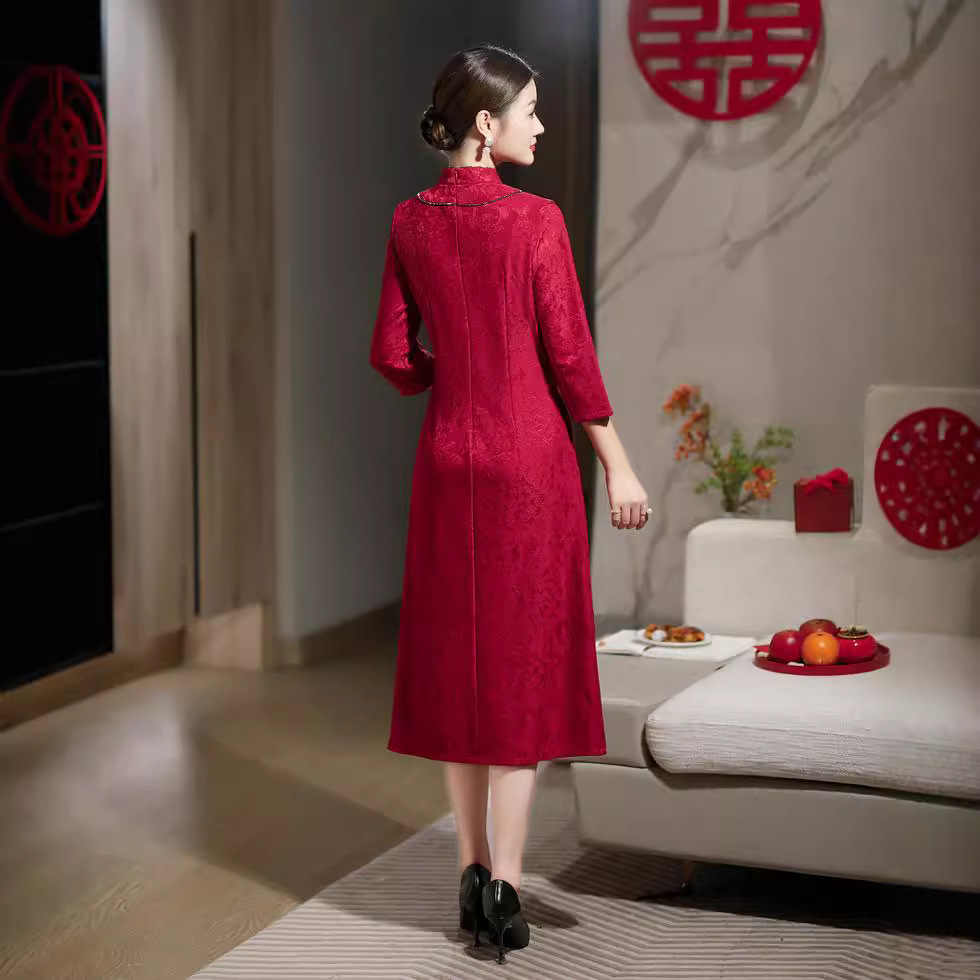 Gaun cheongsam perjamuan pernikahan Ibu musim gugur dan musim dingin gaun roti bakar hukum bahagia merah anggur dapat dipakai pada waktu biasa