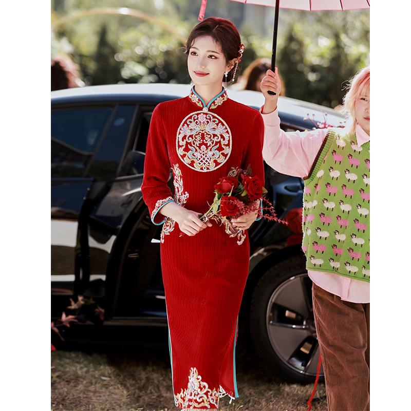 Gaun pengantin bersulang Cheongsam, gaun pertunangan musim dingin pengantin wanita lengan panjang merah baru musim gugur dan musim dingin 2023