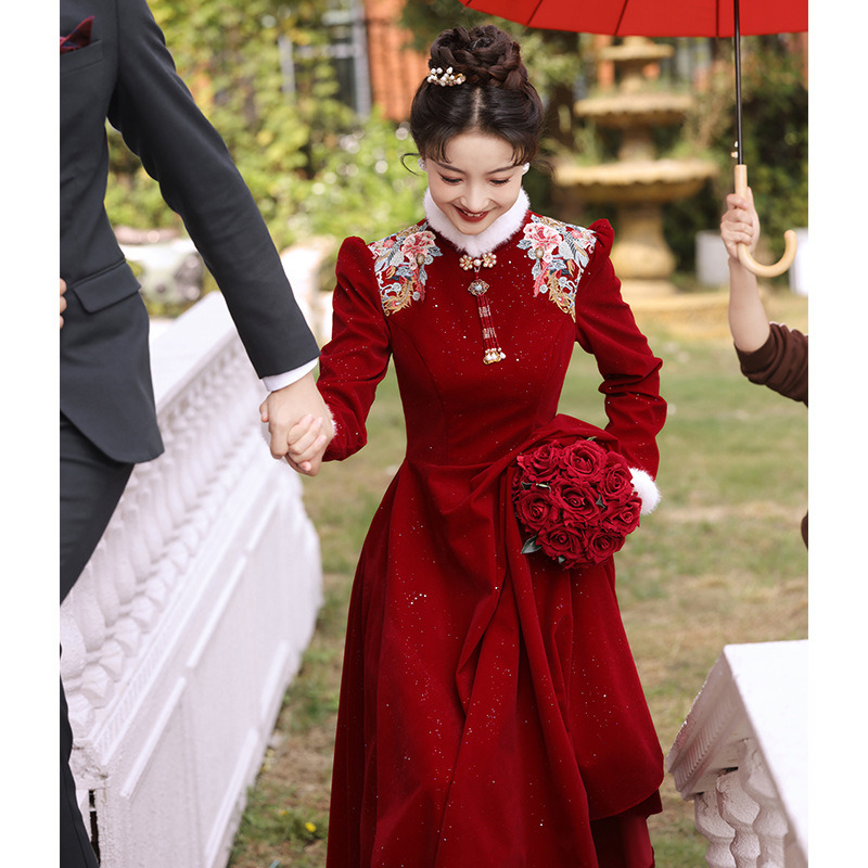 Gaun pengantin bersulang Cheongsam, gaun pertunangan merah anggur pernikahan musim dingin wanita lengan panjang gaya Cina meningkatkan rasa tinggi