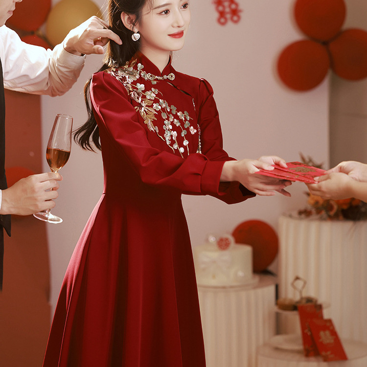 Gaun pengantin Cheongsam, gaun Xiuhe pernikahan kembali ke pintu, gaun merah anggur, gaya Tiongkok penutup lengan tipis untuk wanita musim semi