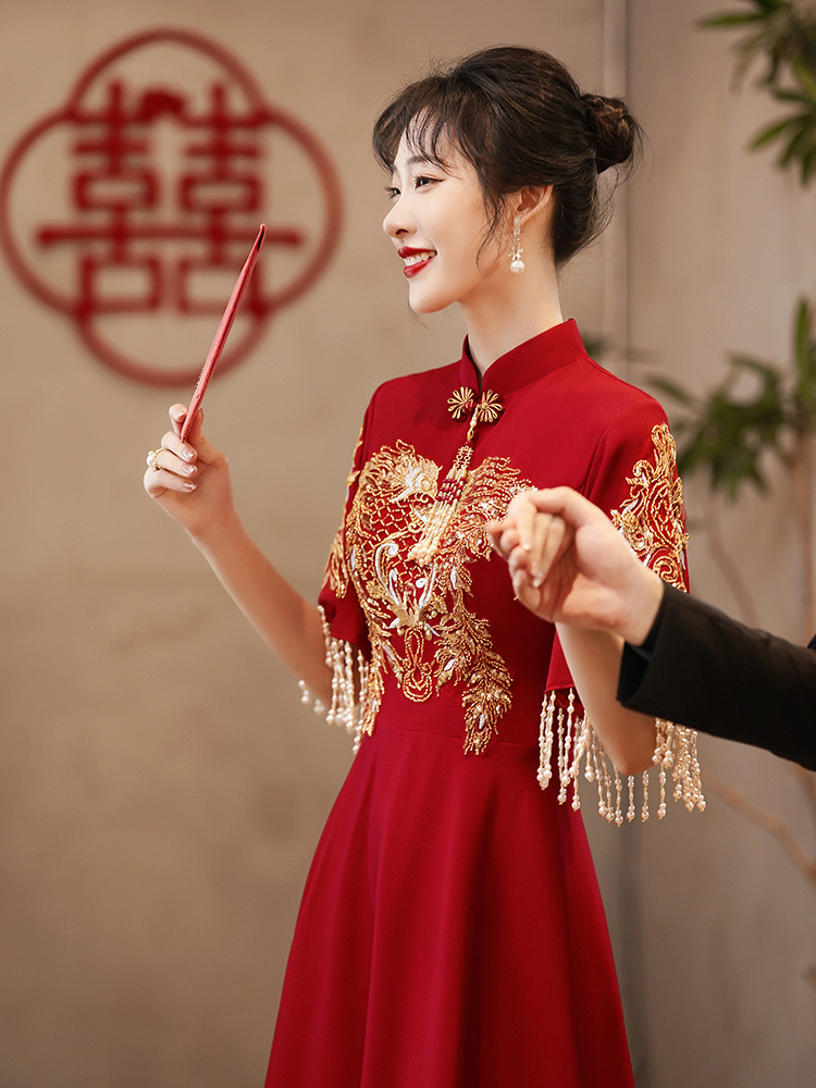 Gaun pernikahan bersulang merah pengantin perempuan, gaun malam elegan ramping cheongsam ditingkatkan bergaya Tiongkok panjang setengah panjang wanita