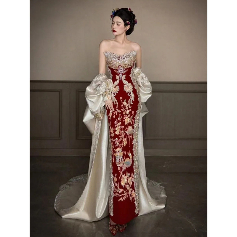 Pakaian Xiuhe Pakaian Pernikahan Pakaian Pernikahan Pengantin Wanita Mewah 2025 Gaya Baru Cheongsam Gaya Tiongkok Pakaian Bersulang Terlihat Langsing Gaun Perjamuan