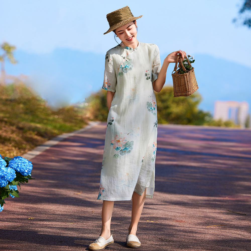 Gaun wanita bercetak Ramie cheongsam, gaun artistik lengan lima perempat modifikasi lotus tinta gaya nasional 24 musim semi dan musim panas