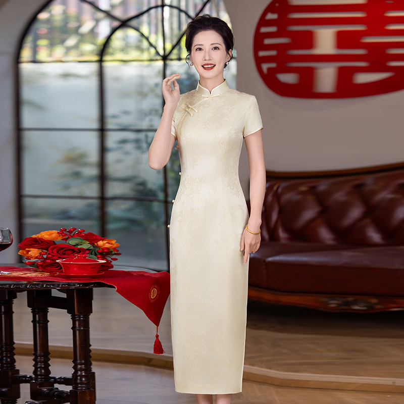 Cheongsam untuk Ibu Muda dan Ibu Muda Versi Modifikasi Asam Asetat Warna Sampanye Musim Panas Model Baru 2025