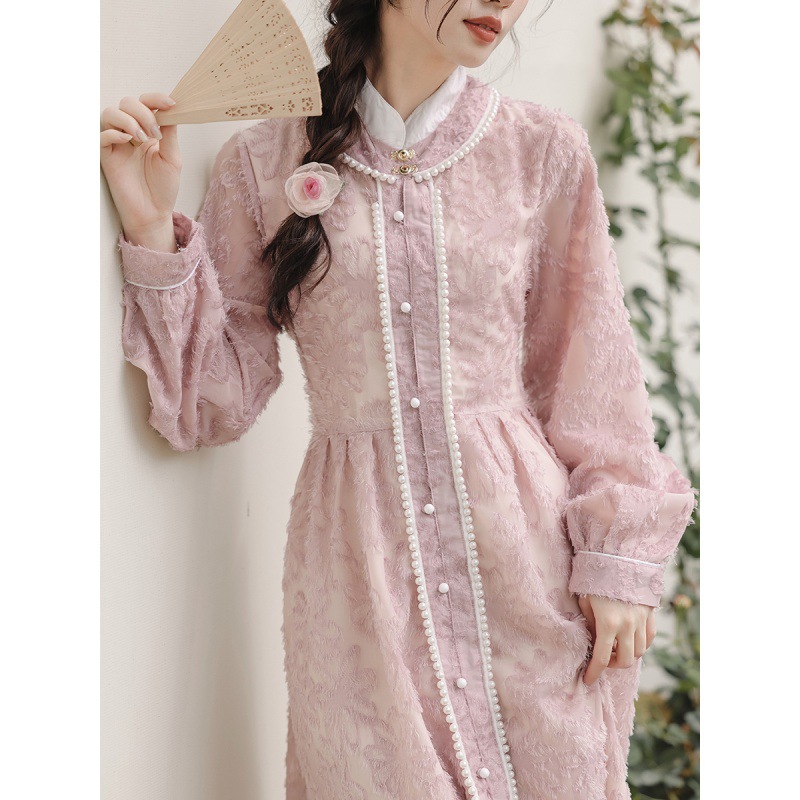 Zhili gaun cheongsam ringan, gaun cheongsam Peningkatan elegan mewah cahaya merah muda, gesper bulu kerah berdiri jacquard gaya Cina baru musim semi dan musim gugur