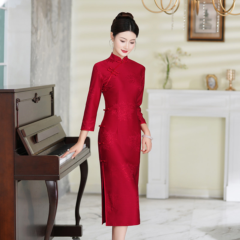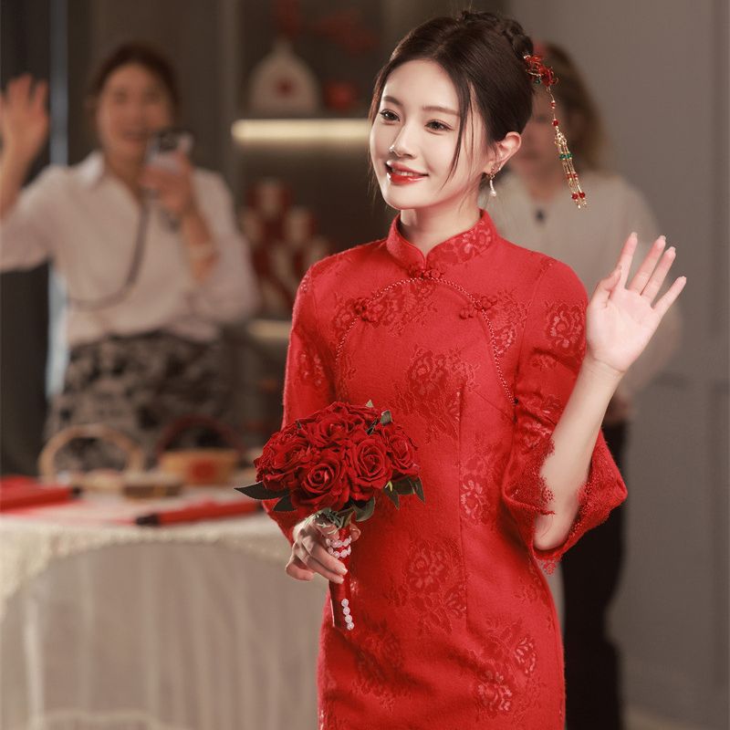 Renda merah setengah panjang 3/4 lengan cheongsam untuk pesta makan Pernikahan 2023 musim gugur baru gaya Cina retro bahagia ibu pakaian bersulang cheongsam