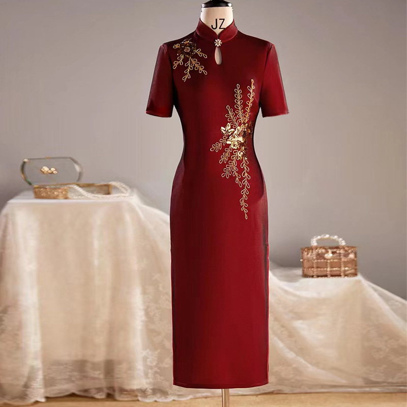 Baju pernikahan lengan pendek cheongsam happy mother-in-law gaun pernikahan musim semi mother-in-law gaun pernikahan gaun pernikahan mulia