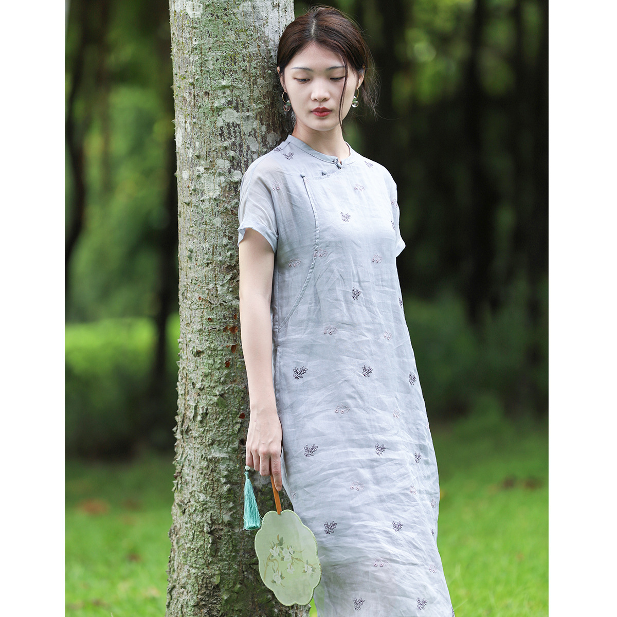 Ramie dress bordir cheongsam ditingkatkan, pakaian wanita desain asli kelas atas artistik klasik kerah berdiri lengan pendek gaun bordir