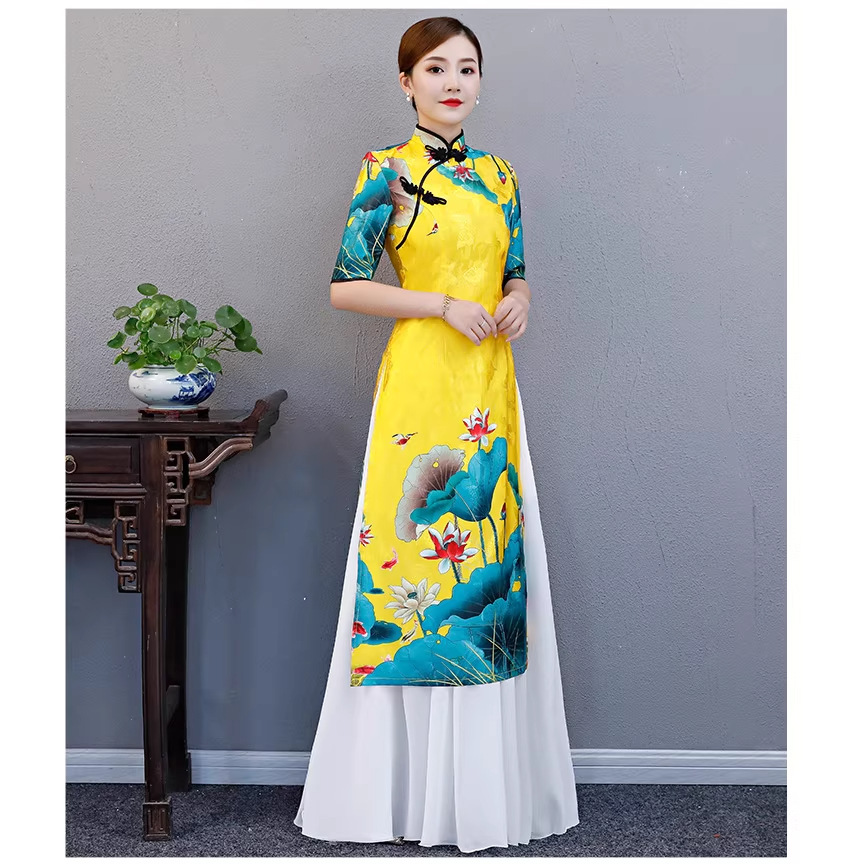 Gaun Paduan Suara Hanfu Gaya Cina Cheongsam Musim Panas yang Elegan, Gaun Pertunjukan Panjang Ao Dai Modifikasi Gaya Cheongsam Royal Sister.