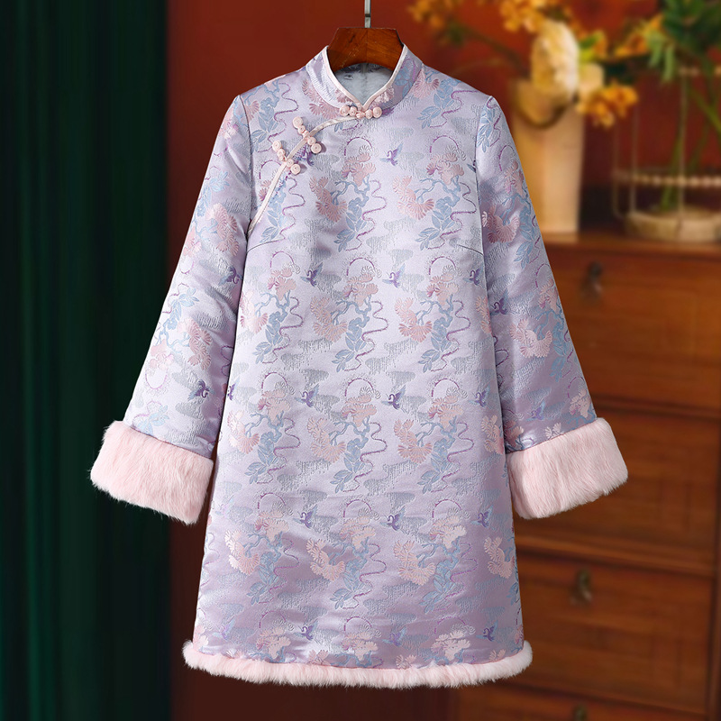 Gaun cheongsam pengiriman satu potong 2023 musim gugur dan musim dingin bulu kelinci jacquard berlapis bulu hangat peningkatan gaya Cina 3699