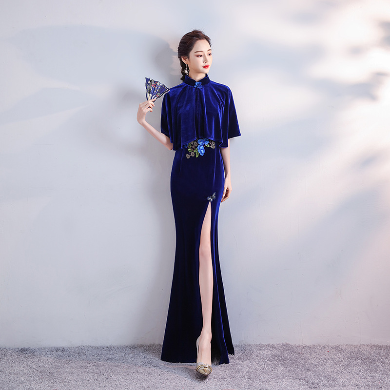 Panjang beludru fashion catwalk kostum cheongsam wanita slim fit peningkatan fishtail gaya Cina gaun pertemuan tahunan pelangsing