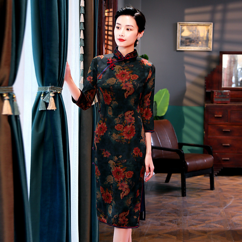 Pembersihan stok ukuran yang sudah dihentikan: Gaun cheongsam slim-fit dengan motif vintage dari benang sutra awan musim semi terbaru 10733.
