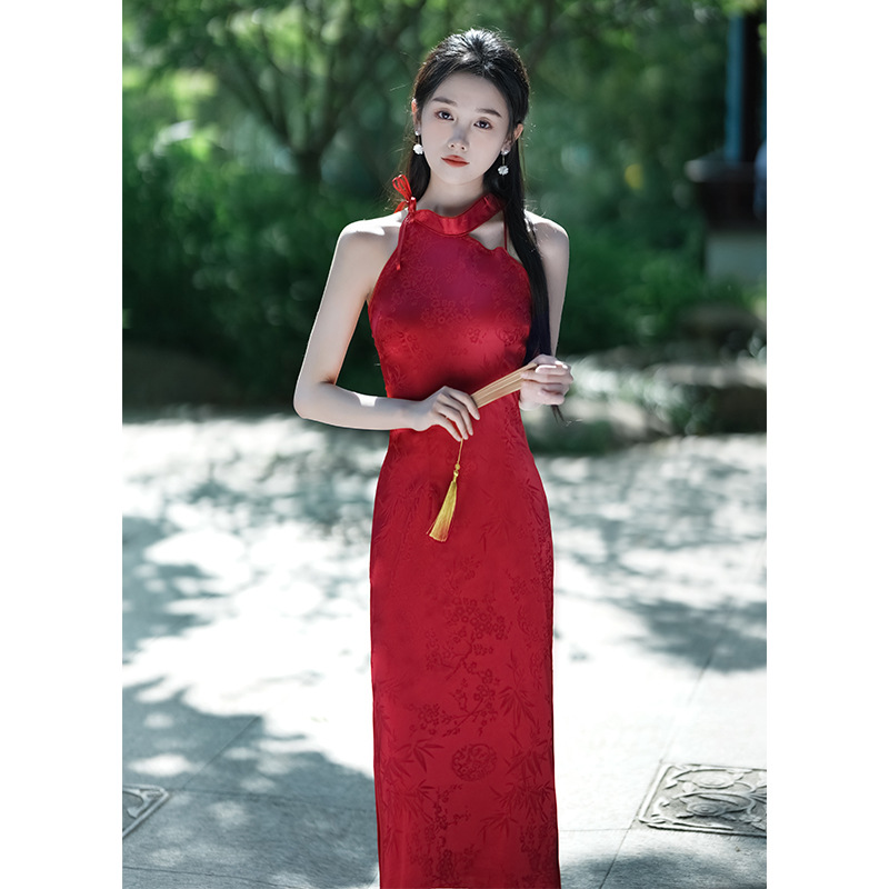 Gaun cheongsam halter gaya Tiongkok muda, baru pernikahan pengantin wanita