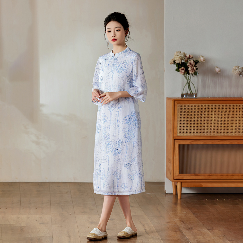 Ramie gaun cheongsam ditingkatkan, Gaun retro longgar lengan terbalik bermanik desain elegan kerah berdiri