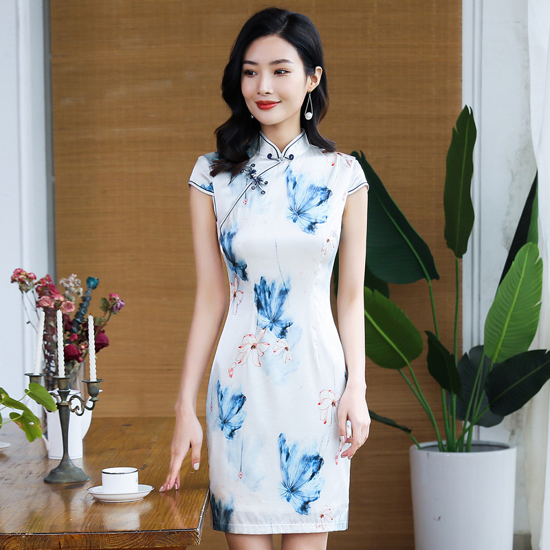 Gaun Cheongsam Kasual Model Pendek Modifikasi Cetak Bunga Teratai Sutra Murbei Model Baru Musim Panas 3612