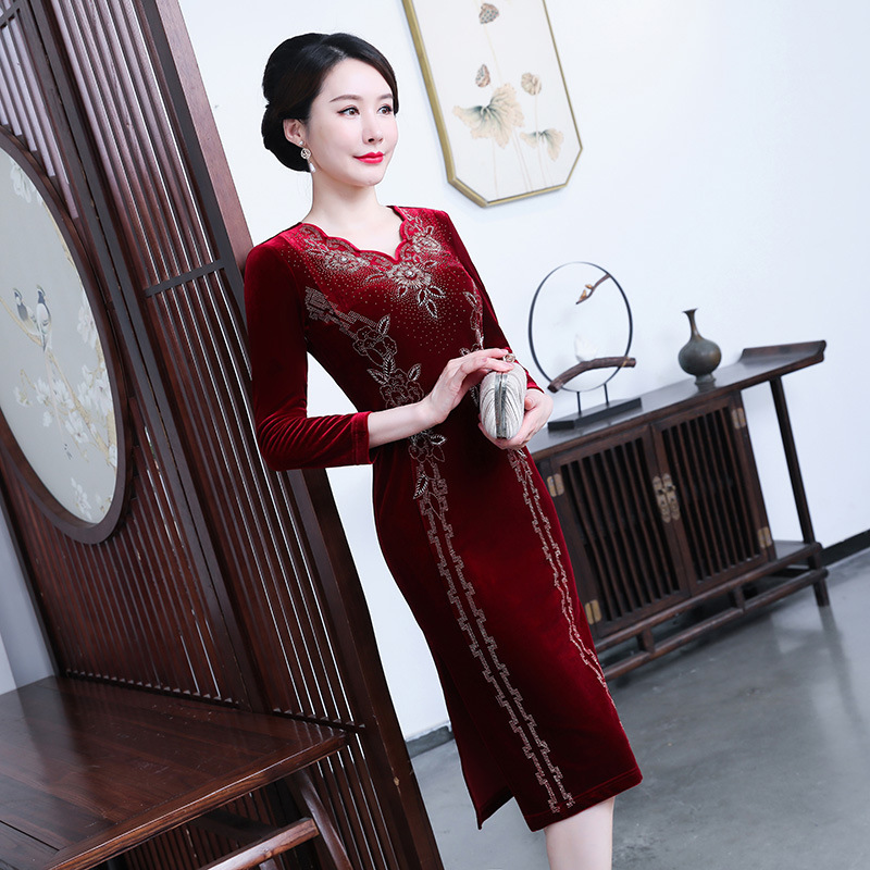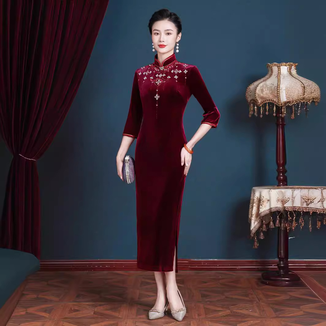 2022 musim gugur dan musim dingin baru ditingkatkan cheongsam beludru Cina panjang menengah happy mother-in-law gaun pernikahan kualitas tinggi gaun roti bakar grosir