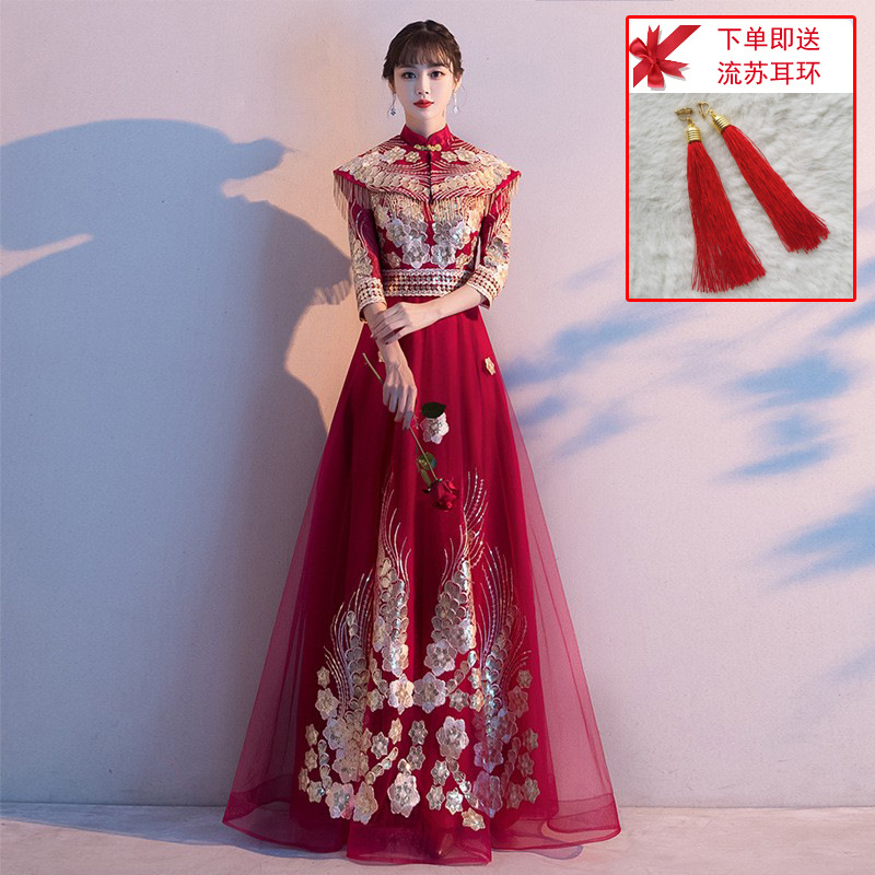 Gaun Xiuhe bergaya Cina untuk acara bersulang, gaun malam pernikahan wanita model baru 2025 warna burgundy elegan dan ramping untuk pengantin wanita