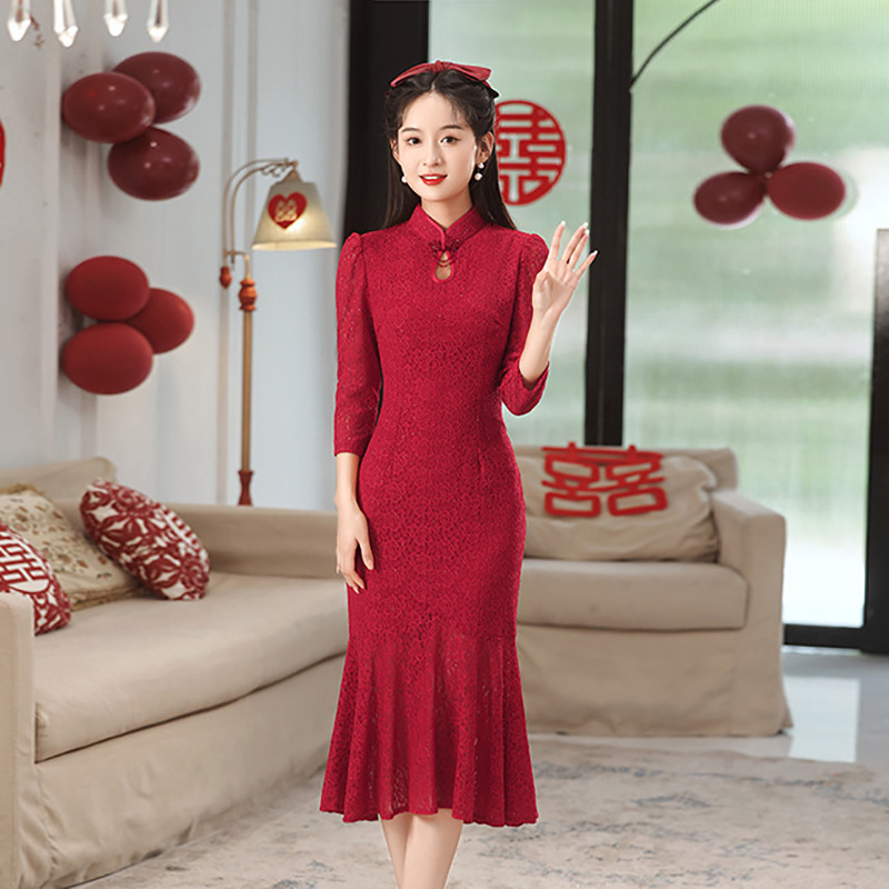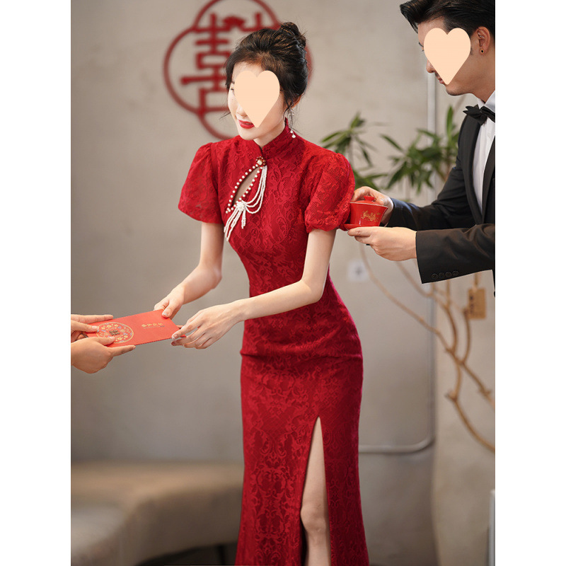 Gaun pengantin Cheongsam, gaun Xiuhe pernikahan kembali ke pintu, gaun merah anggur, gaya Tiongkok penutup lengan tipis untuk wanita musim semi