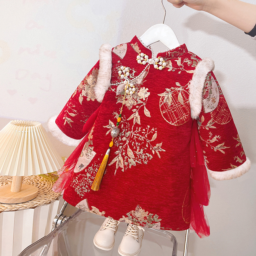 Gaun Anak Perempuan Pakaian Han Pakaian Musim Dingin Ditambah Beludru Ekstra Tebal Rok Putri Gaun Anak-anak Cheongsam Pakaian Tahun Baru Imlek Gaya Tiongkok