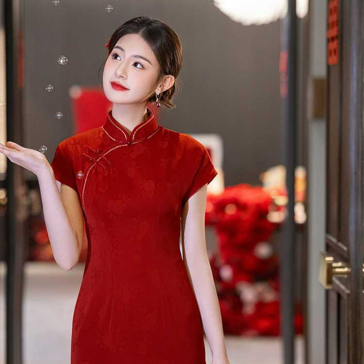 Gaun bersulang Cheongsam gaya Tiongkok merah gaun tunangan muda ditingkatkan kecil pernikahan pengantin wanita pelangsing musim panas