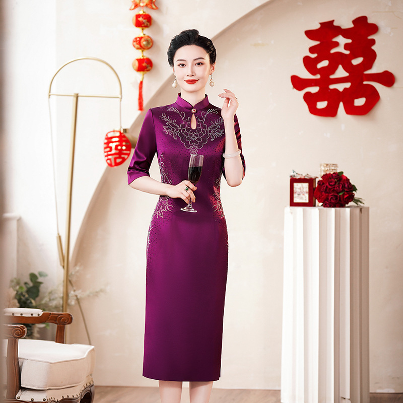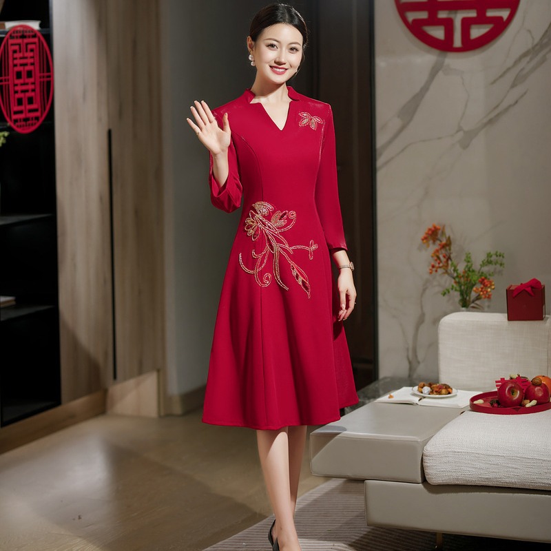 Gaun Pernikahan Ibu mertua Musim Gugur dan Musim Dingin Model Baru Gaun Pernikahan Ibu mertua Cheongsam Rok Bordir Peony Mulia Terlihat Kurus