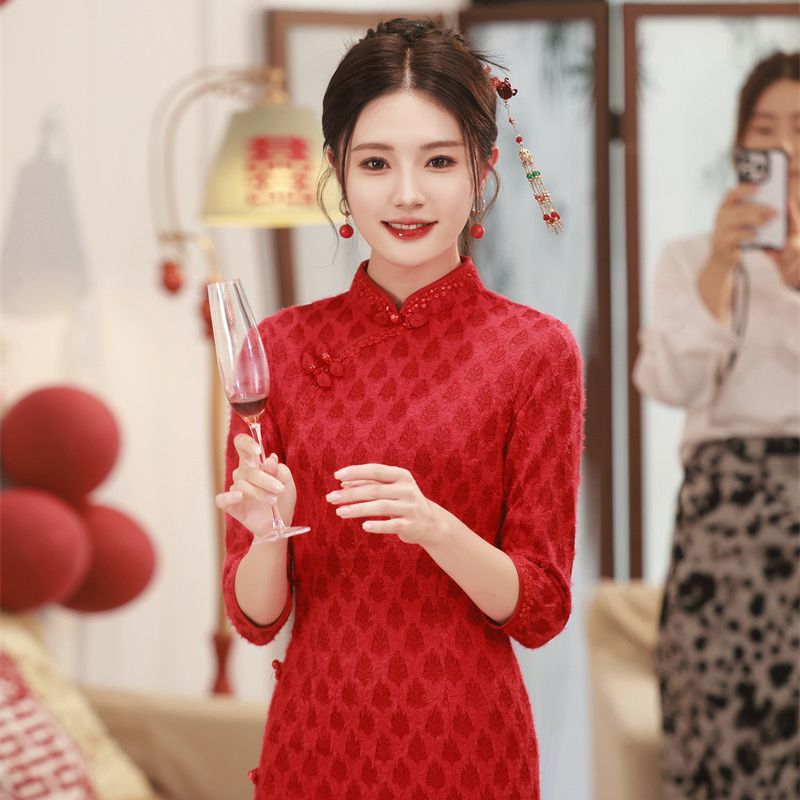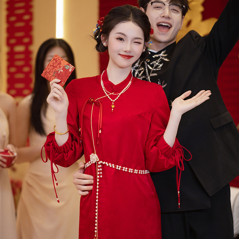 Jubah Pagi Pernikahan Wanita Cheongsam Modifikasi Gaya Tiongkok Baru Pernikahan Pengantin Wanita Gaun Kecil Retro Gaya Tinggi Gaya Nasional Merah Musim Gugur dan Musim Dingin