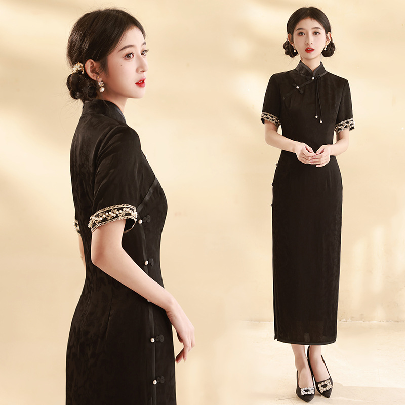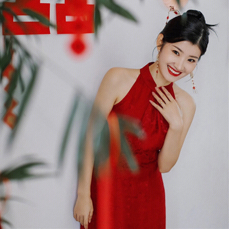 Gaun pengantin cheongsam toast, gaun malam pernikahan wanita, Gaun panjang tampak punggung terbuka, ramping, gaya Tiongkok, Gaun jamuan makan malam pengantin