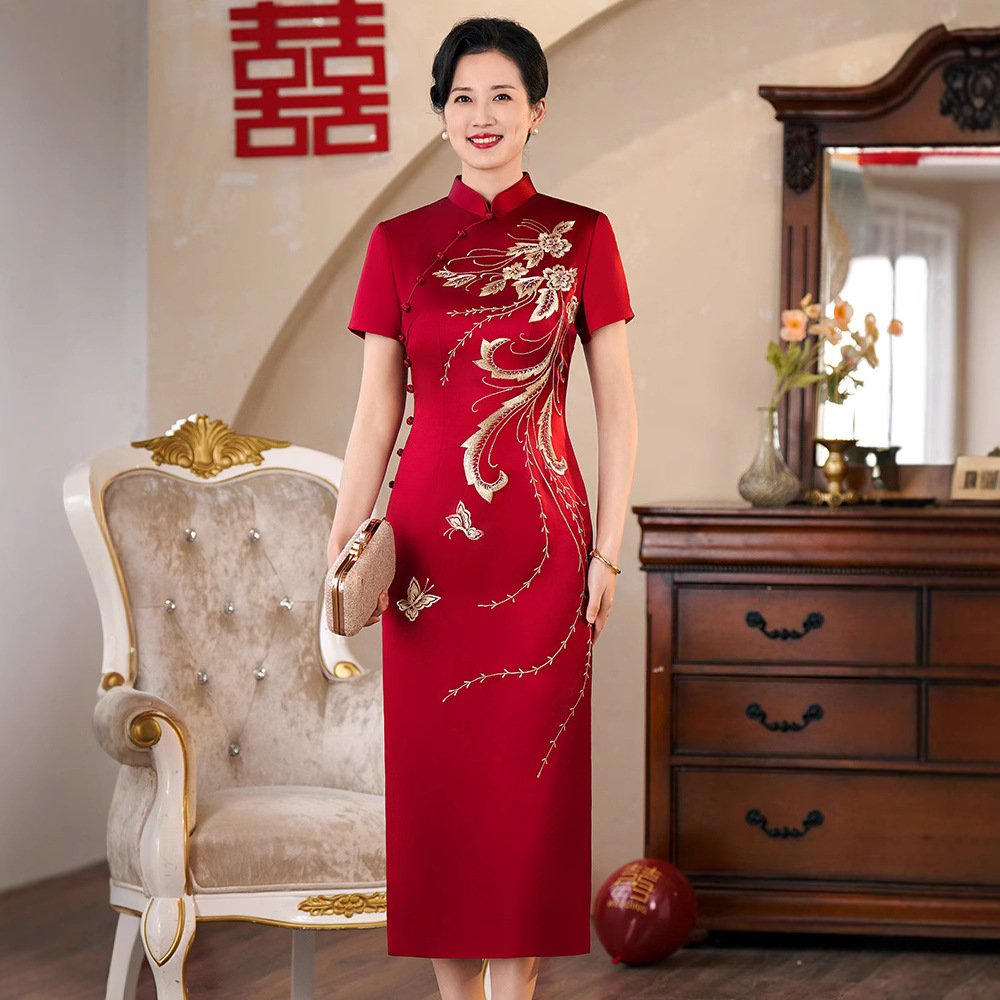 Cheongsam Pernikahan Ibu Gaun Merah Bordir Asam Asetat Gaya Tiongkok Pakaian Pesta Pernikahan Ibu mertua Model Baru 2025 Wanita 60650