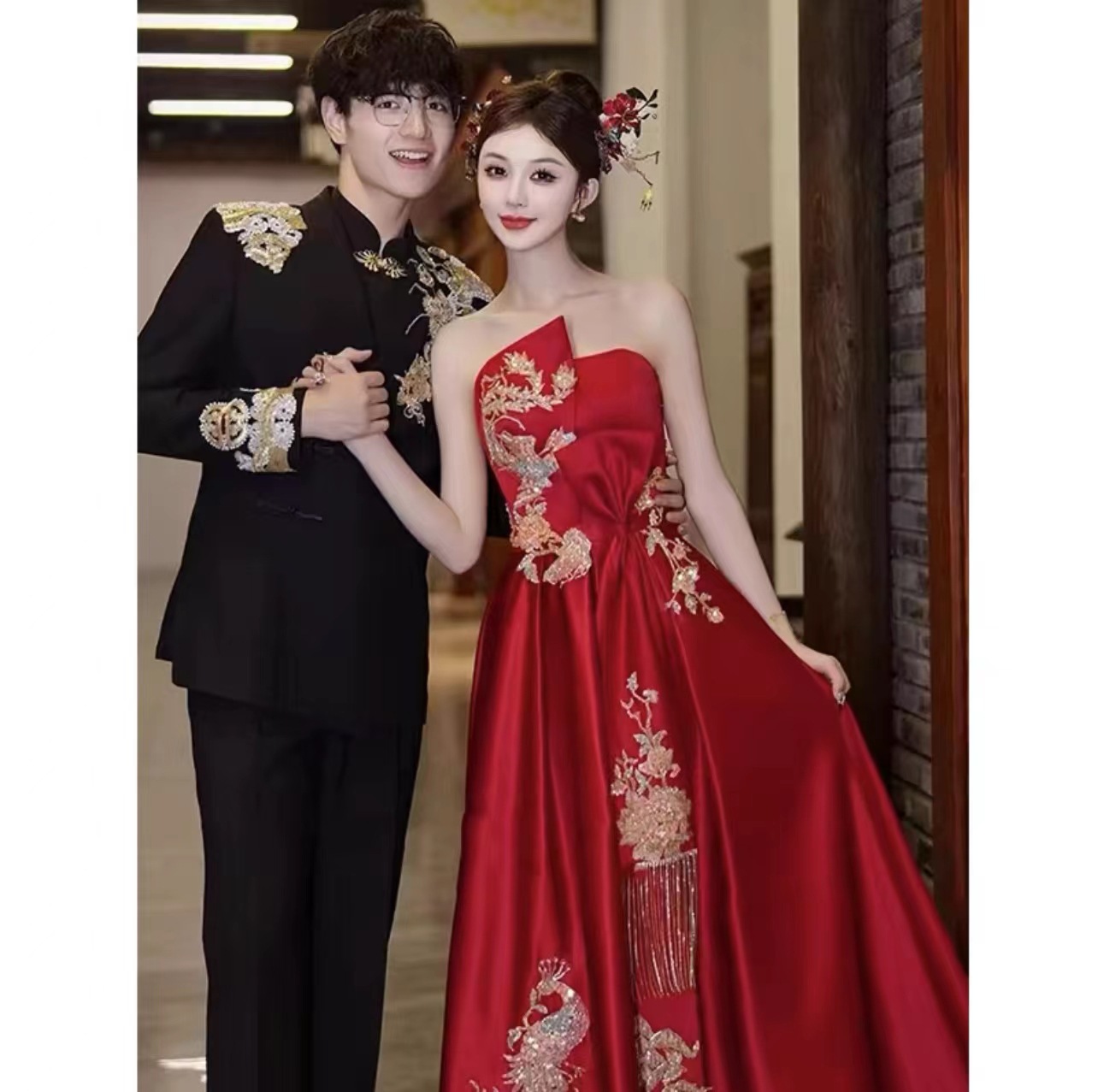 红色敬酒服抹胸重工高端轻奢新中式新娘结婚国风订婚高级感礼服裙