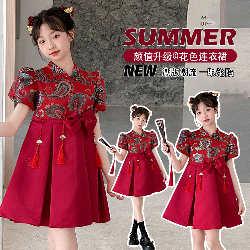 儿童旗袍连衣裙透气夏季新款儿童新款印花旗袍裙纱裙汉服裙公主裙