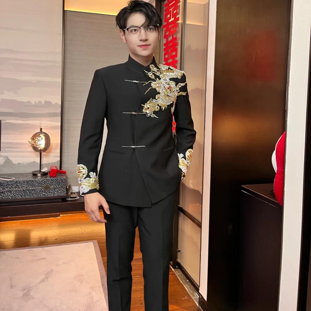 Pakaian Zhongshan Gaya Tiongkok Baru Setelan Pernikahan Pria Jaket Kerah Tegak Warna Hitam Gaun Pengantin Pria Gaya Tiongkok