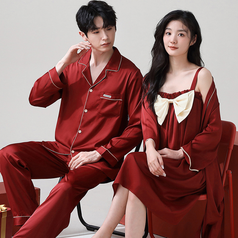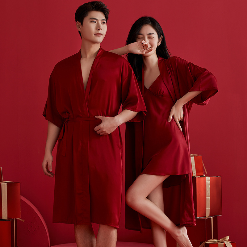Piyama pernikahan pasangan, pakaian pernikahan merah sutra es gaun pagi pengantin laki-laki Ruang Keluarga