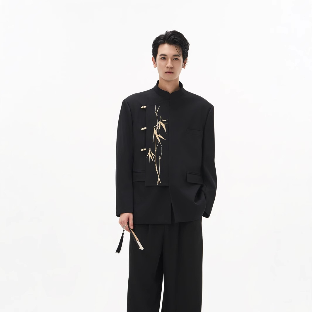 Setelan Gaya Cina Baru Gaya Cina Bambu Emas Lipat Pakaian Barat Kelas Atas Kasual Longgar Bordir Bunga Pakaian Zhongshan Pakaian Pengiring Pengantin Pria