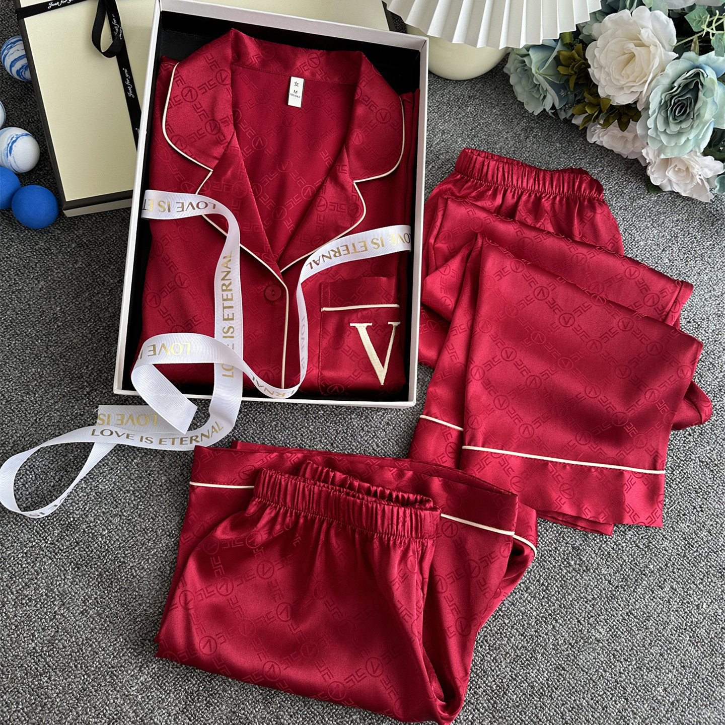 Piyama pasangan pengantin wanita, baju sutra es merah lengan panjang bercetak dobel Hi