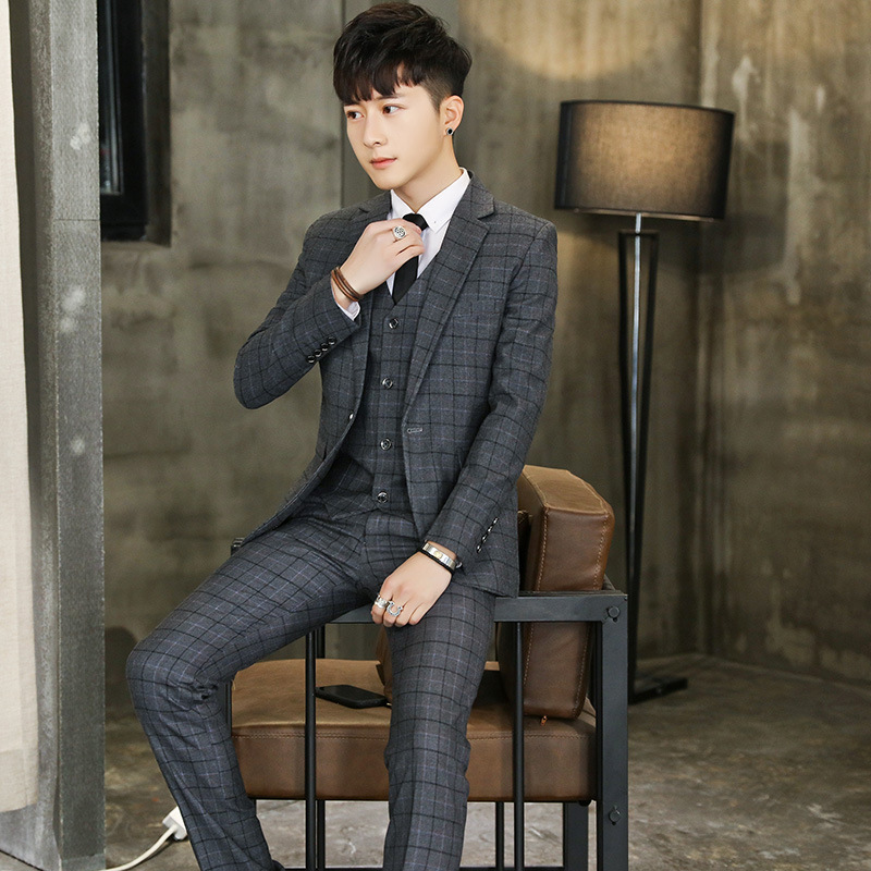 Setelan baru musim semi tiga potong gaya Korea slim-fit setelan kotak-kotak pernikahan pengantin pria gaun bisnis pakaian