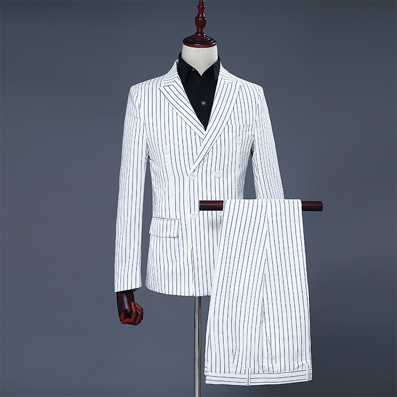 Gaun pengiring pengantin pria, latar belakang putih hitam bergaris pengiring pengantin pria kancing dua baris, setelan penampilan tuan rumah MC studio tema