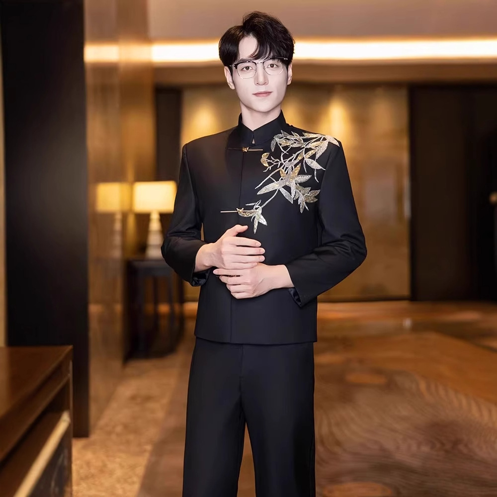 Pakaian Pria Gaya Tiongkok Baru Pakaian Pria Gaya Tiongkok Pakaian Pria Pertunjukan Pernikahan Setelan Jas Pengantin Pria Kerah Tegak Pakaian Zhongshan Pria