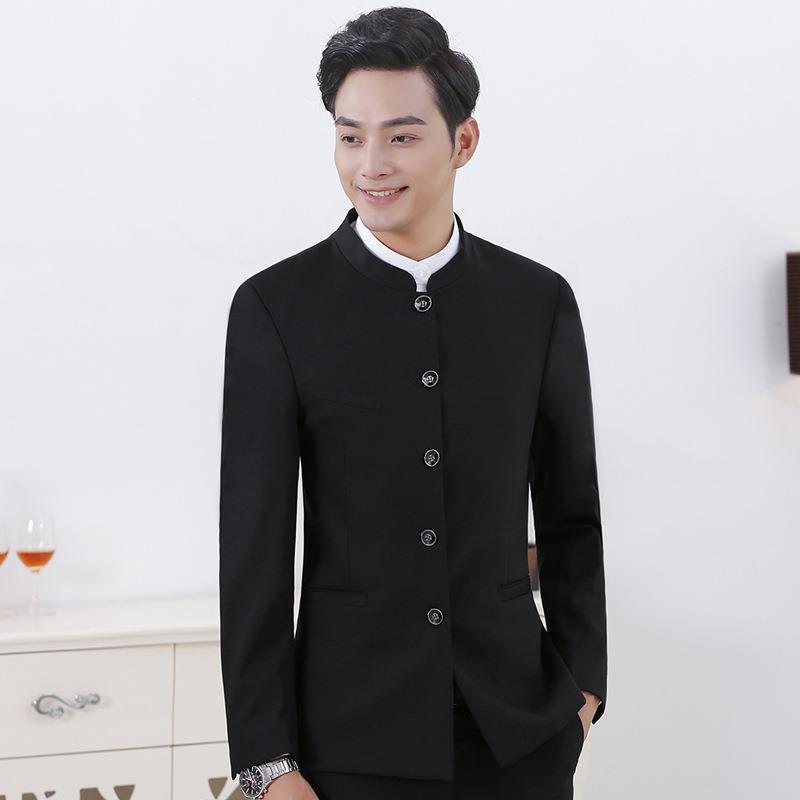 Pakaian wol gaya Tiongkok untuk pria, pakaian setelan perjamuan kerah berdiri pemuda, setelan Zhongshan host penyanyi warna hitam