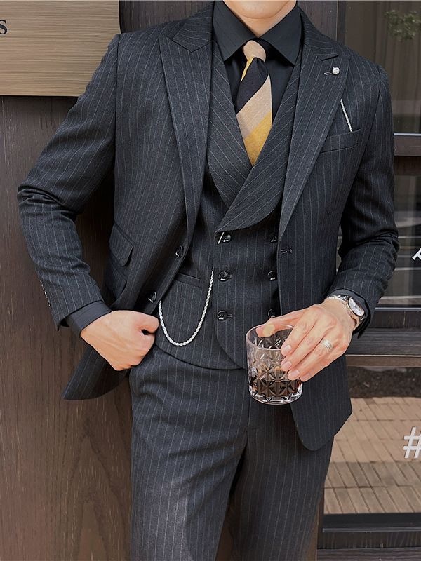 Gaun pria bergaya Inggris, slim-fit kancing ganda bergaris, setelan tiga potong ramping saku ganda untuk pengiring pengantin