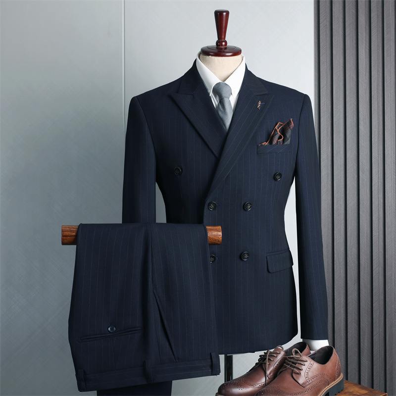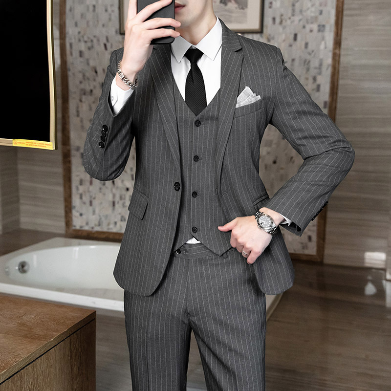 Setelan pakaian bisnis pria, pakaian tiga potong bergaris vertikal bisnis ringan musim semi baru pemuda ramping pas
