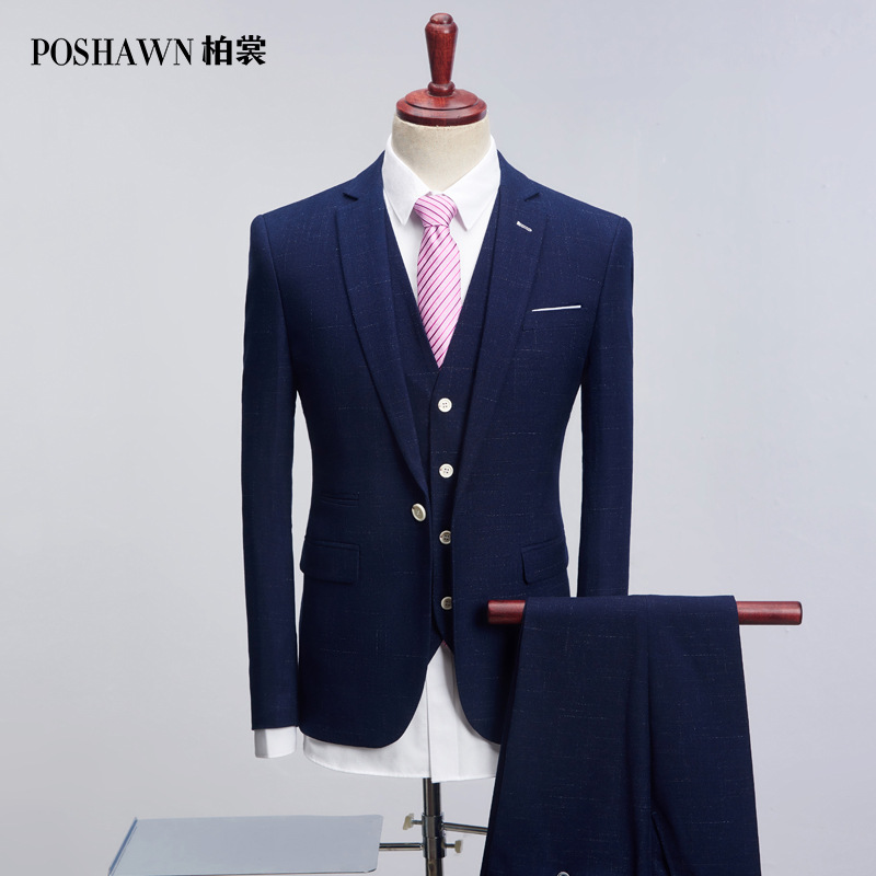Setelan bisnis Boshang pria setelan gaya Korea pas badan biru dongker setelan tiga potong gaun acara pernikahan dan pengantin pria