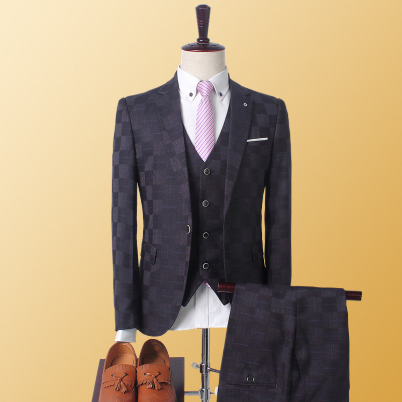 Setelan tiga potong untuk pria, setelan kotak-kotak bisnis kasual profesional slim fit pengantin laki-laki gaun pernikahan pengiring pengantin
