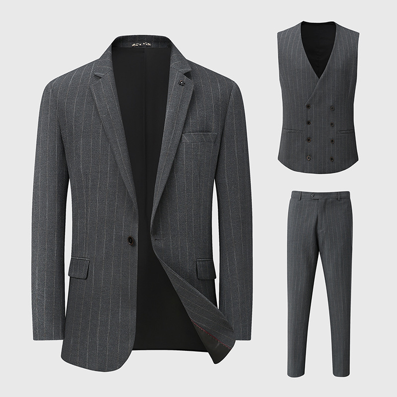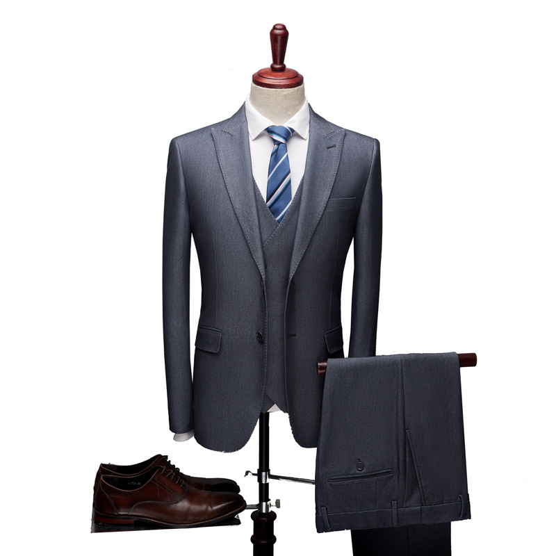 Setelan butik pakaian pria tiga potong, gaun pas badan gaya Korea untuk pernikahan, setelan abu-abu gelap