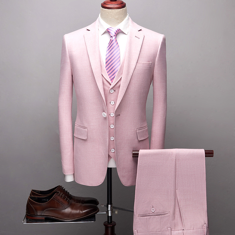 Setelan pakaian wol untuk pria, setelan bisnis kasual modis gaya Korea slim-fit, tiga buah, gaun pengantin warna merah muda untuk pria