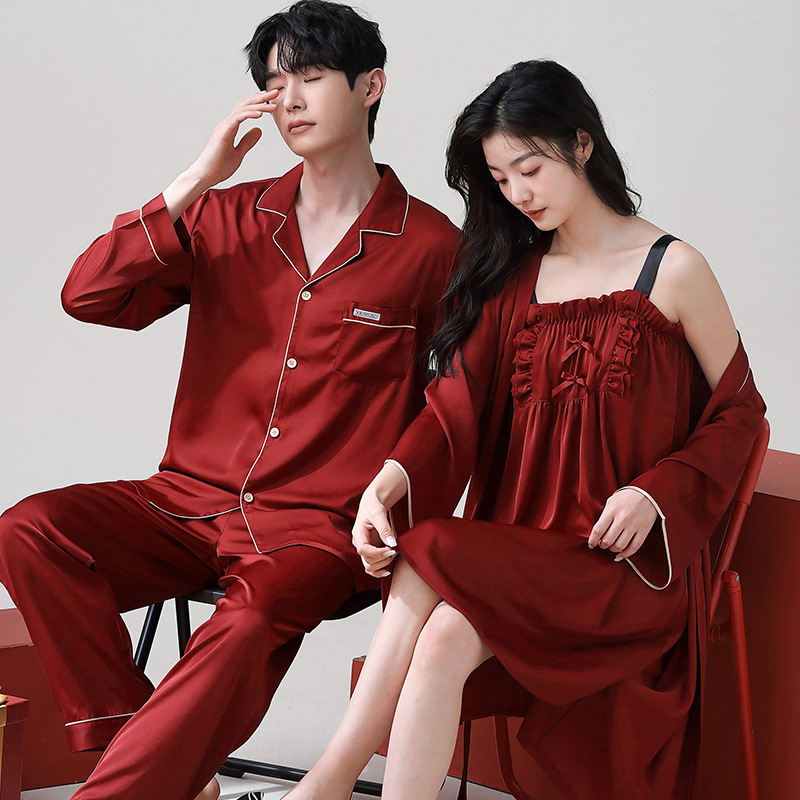 Piyama pernikahan pasangan, pakaian pernikahan merah sutra es gaun pagi pengantin laki-laki Ruang Keluarga