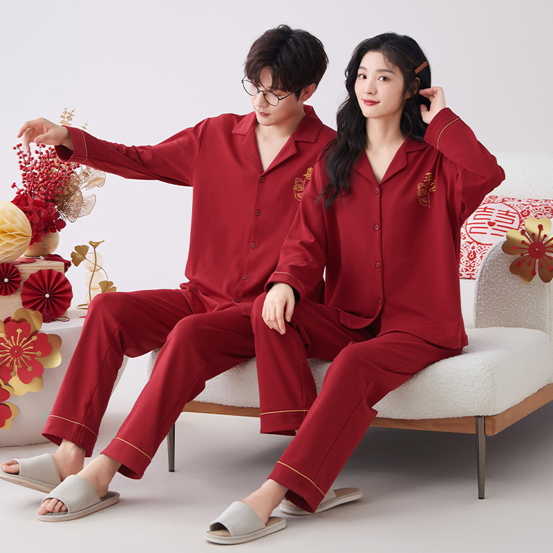 Piyama pernikahan katun murni untuk pasangan, pakaian rumah satu pria dan satu wanita musim gugur dan musim dingin, piyama pernikahan musim semi dan musim gugur