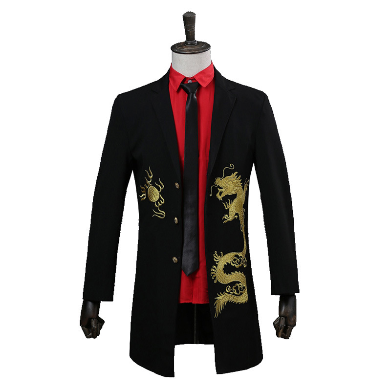 Gaun pria setengah panjang setelan naga emas mantel trench gaun pertunjukan pengantin pria gaun pengiring pengantin bordir mantel selamat datang