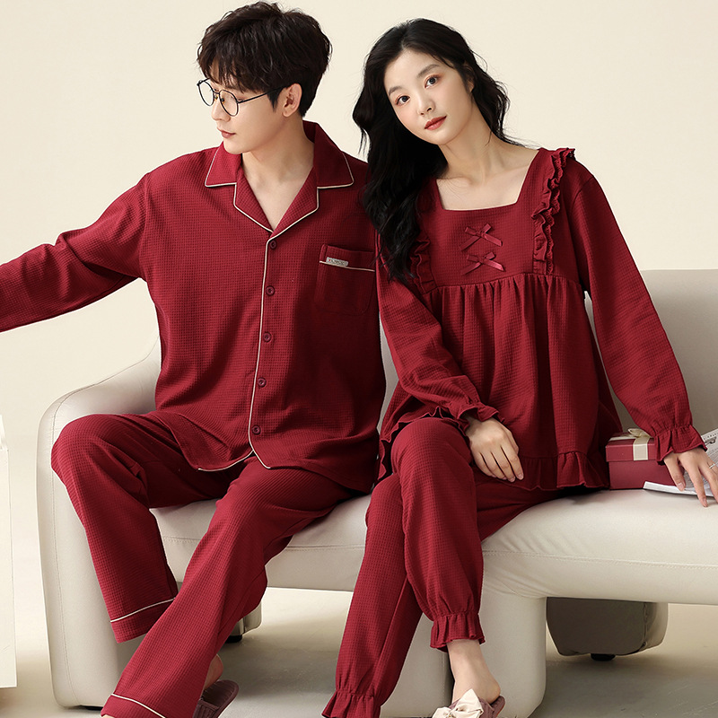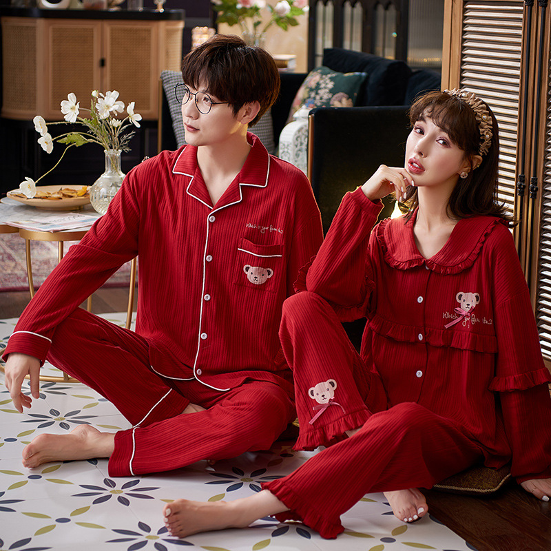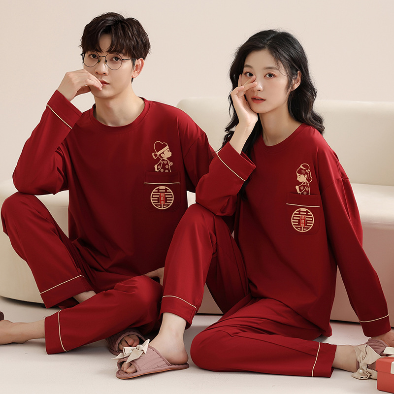 Piyama pasangan katun lengan panjang, pakaian pernikahan pengantin laki-laki merah lengan panjang Musim Semi dan Gugur