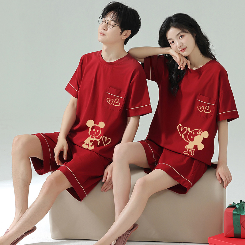 Piyama pernikahan pengantin pria dan wanita, setelan pasangan kelas atas musim panas katun lengan pendek pakaian rumah
