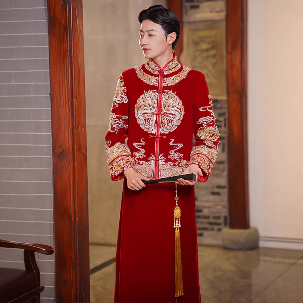 Pakaian Beludru Pakaian Pria Model Baru 2024 Pakaian Pengantin Pria Pakaian Tang Gaun Longfeng Pakaian Pesta Anggur Gaya Tiongkok Pakaian Pernikahan High-end